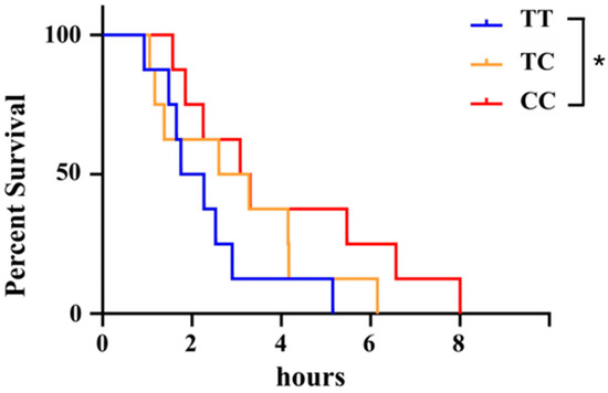 Survival curves of individuals with the TT (blue), TC (orange), and CC (red) genotypes (n = 20) under hypoxic stress. There was a statistically significant difference between the TT genotype and TC genotype. * p < 0.05.