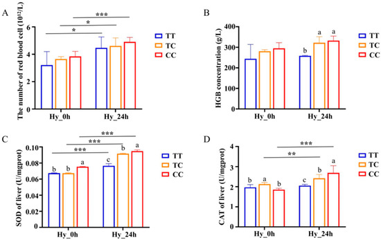 Alterations in red blood cell number (A), hemoglobin concentration (B), SOD activity (C), and CAT activity (D) induced by hypoxic conditions across individuals of three different genotypes. Data are shown as the mean ± SD (n = 3). Hy_0h refers to normoxia, indicating no exposure to hypoxia. Hy_24h denotes exposure to hypoxia (2 mg/L) for a duration of 24 h. Blue represents the TT genotype, orange represents the TC genotype, and red represents the CC genotype. Distinct letters denote statistically significant differences (p < 0.05) among the three genotypes at a single time point. Asterisks indicate statistically significant differences within the same genotype across two time points (* p < 0.05, ** p < 0.01, *** p < 0.001).