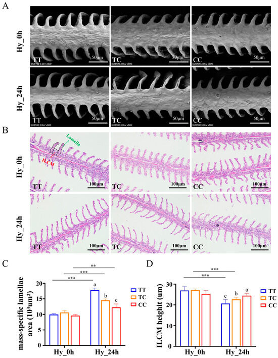 Structural changes in gills induced by hypoxic conditions across the three distinct genotypes. The microstructural analysis of the gills from individuals of various genotypes was conducted using scanning electron microscopy (A) and HE staining (B), with scale bars located in the lower right-hand corners. (C) The surface area measurements of the gill lamellae in individuals of different genotypes following normoxic and hypoxic treatments. (D) The variations in interlamellar cell mass (ILCM) thickness among individuals of different genotypes under normoxic and hypoxic conditions. Green arrows denote the gill lamellae, while red arrows indicate the ILCM between two adjacent gill lamellae. Data are shown as the mean ± SD (n = 3). Hy_0h refers to normoxia, indicating no exposure to hypoxia. Hy_24h denotes exposure to hypoxia (2 mg/L) for a duration of 24 h. Blue represents the TT genotype, orange represents the TC genotype, and red represents the CC genotype. Distinct letters denote statistically significant differences (p < 0.05) among the three genotypes under hypoxic stress. Asterisks indicate statistically significant differences within the same genotype across two time points (** p < 0.01, *** p < 0.001).