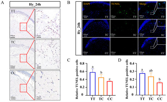 TUNEL staining of the brains in the three genotypes after exposure to hypoxia. (A) Light microscope micrographs depict brain cell apoptosis after 24 h of hypoxia. Apoptotic cells are indicated by a brown coloration, whereas normal cells are represented by a light blue hue. The right panel presents a magnified view of the area enclosed within the red box on the left. (B) Fluorescence microscopy detection of brain cell apoptosis after 24 h under the hypoxic condition. Apoptotic cells are shown in green fluorescence, DAPI staining (blue) represents the nuclei. The white box located in the upper right corner represents an enlarged view of the area delineated by the dotted line. (C) The statistics of the apoptosis rate in the brain under a light microscope after 24 h of hypoxia. (D) The statistics of the apoptosis rate in the brain under fluorescence microscopy after 24 h of hypoxia. Data are shown as the mean ± SD (n = 3). Blue represents the TT genotype, orange represents the TC genotype, and red represents the CC genotype. Different letters indicate significant differences (p < 0.05).