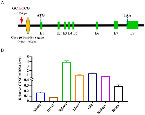Structural and expression characteristics of the CTSC gene. (A) Schematic representation of the CTSC gene architecture. Orange ovals represent core promoter regions, and green boxes denote exons. (B) Expression profiles of the CTSC gene across different tissues in silver carp. Data are shown as the mean ± SD (n = 3).