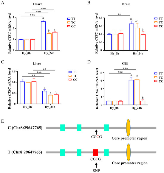 Through association analysis of the SNP loci, it was determined that the SNP was situated in the upstream promoter region of the CTSC gene (Figure 5A). We hypothesized that variations in the genotypes of these SNP loci might influence the expression of the CTSC gene. Consequently, we examined the expression levels of the CTSC gene across three genotypes under conditions of hypoxic stress. The liver, brain, heart, and gills are critical tissues sensitive to hypoxia and are closely associated with energy and oxygen metabolism. Therefore, we selected these four tissues to assess the expression of CTSC across different genotypes following 24 h of hypoxic stress.