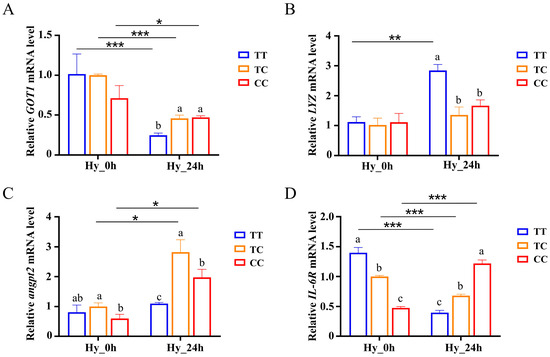 Analysis of immune-related gene expression in the liver after hypoxia. Changes in GOT1 (A), LYZ (B), angpt2 (C), and IL-6R (D) gene expression under hypoxia stress. Data are shown as the mean ± SD (n = 3). Hy_0h refers to normoxia, indicating no exposure to hypoxia. Hy_24h denotes exposure to hypoxia (2 mg/L) for a duration of 24 h. Blue represents the TT genotype, orange represents the TC genotype, and red represents the CC genotype. Distinct letters denote statistically significant differences (p < 0.05) among the three genotypes under hypoxic stress. Asterisks indicate statistically significant differences within the same genotype across two time points (* p < 0.05, ** p < 0.01, *** p < 0.001).