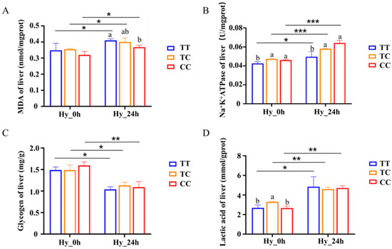 Change in MDA (A), Na+/K+-ATP (B), glycogen (C), and lactate (D) concentration under hypoxia stress. Data are the mean ± SD (n = 3). Hy_0h refers to normoxia, indicating no exposure to hypoxia. Hy_24h denotes exposure to hypoxia (2 mg/L) for a duration of 24 h. Blue represents the TT genotype, orange represents the TC genotype, and red represents the CC genotype. Distinct letters denote statistically significant differences (p < 0.05) among the three genotypes under hypoxic stress. Asterisks indicate statistically significant differences within the same genotype across two time points (* p < 0.05, ** p < 0.01, *** p < 0.001).