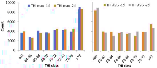Distribution of records across the different classes of maximum THI (THIMAX, on the left) and average THI (THIAVG,on the right).