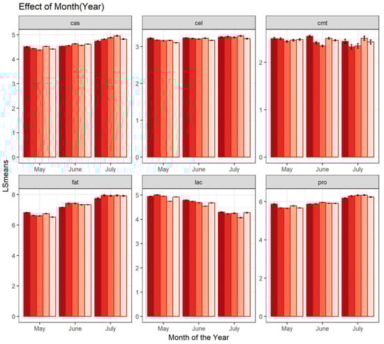 Effect of month nested within year for the 6 analyzed traits (cas = casein%; cel = log10SCC, cmt = total bacterial count, fat = fat%, lac = lactose%, pro = protein%); bars with red color gradient respectively represent a different sampling year. Dark red: first year of sampling; light pink: fifth year of sampling.