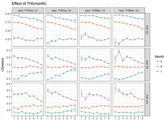 Effects of THI class (on x-axes) nested with month of the year on milk fat composition (lac = lactose%, fat = fat% and pro = protein%). THIMAX: 1 ≤ 64, 2: [64–66], …, 8: >78; THIAVG: 1 ≤ 60, 2: [60–62], …, 8: >72.