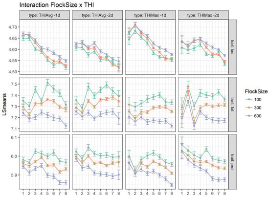 Least square means for milk fat composition (lac = lactose, fat = fat% and pro = protein%), highlighting the interaction THI × flock size. THIMAX: 1 ≤ 64, 2: [64–66], …, 8: >78; THIAVG: 1 ≤ 60, 2: [60–62], …, 8: >72.