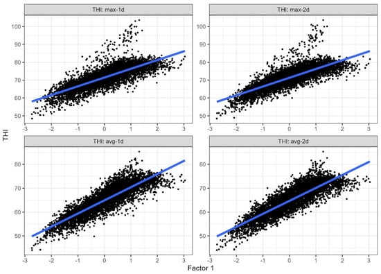 Linear regression between MMI (Factor 1) on the x-axes and THI values on the y-axes (max and average) recorded −1 or −2 days before milk sampling.