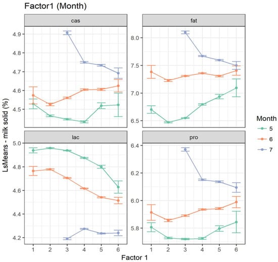 Effect of MMI (Factor 1 (month)) on milk composition (fat = fat%, cas = casein%, lac = lactose%, pro = protein%).