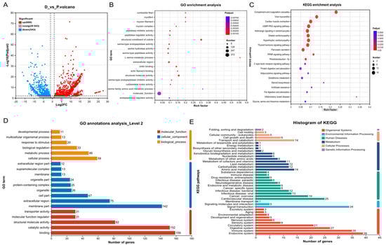 Differentially expressed genes (A) before molting (D2 and D3) and after molting (A,B) and their GO functional enrichment (B), KEGG functional enrichment (C), GO annotation (D), and KEGG functional annotation (E).