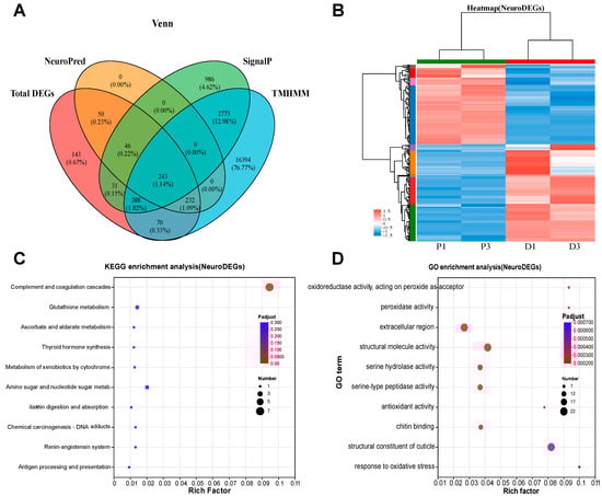 Based on neuropeptide prediction, signal peptide, and transmembrane structure screening of differential neuropeptides involved in molting (A) and their expression heat map (B), KEGG enrichment (C), and GO enrichment analysis (D). NeuroPred represents differential neuropeptide genes predicted by NeuroPred; SignalP represents differential genes with signal peptides; TMHMM represents differential genes without transmembrane structures.