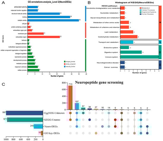 KEGG annotation (A), GO annotation (B), and upset plot of key neuropeptide gene screening (C) for molting-regulated neuropeptides.
