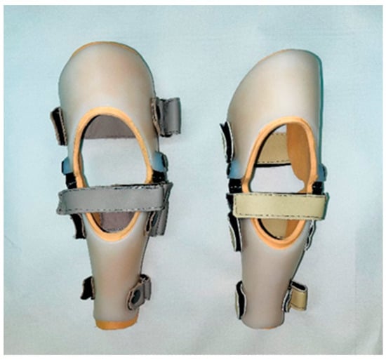 Before the orthoses were manufactured, precise measurements of the injured limb were taken, including the limb’s length (from the hip to the knee joint, from the knee joint to the heel, and from the heel to the toes) and the circumference of the limb at 2 cm intervals. A negative model of the limb was taken using plaster bandages, which was then filled with plaster to produce a positive model. The plaster positive was processed in such a way that all bone points were relieved, thus avoiding damage to the skin. Polyform foam 4 mm was applied to the model, 3D-printed joints were added in the knee joint area (medial and lateral), and polypropylene plastic 4 mm was applied over the model using the heating method (170 °C) and vacuum. The polypropylene was cut out of the model together with the foam and the joints, the edges were sanded, and 4 Velcro fasteners were attached (3 on the posterior side, 1 on the anterior side at the level of the patellar ligament). The orthoses were designed with a four-point force system to provide anteroposterior stabilization of the stifle joint (Figure 2).