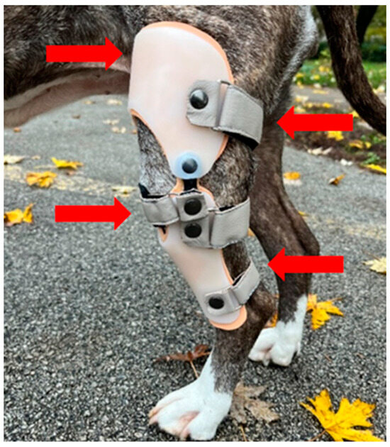Orthoses are increasingly used in veterinary medicine for various orthopedic conditions, depending on the specific needs of the patient and the nature of the injury or disease [7]. Their primary functions include restricting, controlling, or supporting limb movement, thereby stabilizing joints, relieving pain, and preventing further injury. Additionally, orthoses act as a protective shield, reducing stress on damaged or vulnerable tissues and shielding them from external factors [8]. In veterinary clinical practice, orthoses are often used to stabilize joints affected by conditions such as a ruptured CCL, hip or knee dysplasia, ligament injuries, and fractures [9]. They also play a significant role in post-surgical rehabilitation, enabling controlled movements that facilitate healing while minimizing the risk of re-injury [10]. Beyond their therapeutic application, orthoses are invaluable in preventive care. They help prevent joint overload, reduce the risk of further injuries, and improve overall limb functionality by maintaining proper biomechanics during movement [11]. However, knee orthoses can also cause some side effects, such as skin irritation, the limited mobility of adjacent joints, or the inability of the animal to accept mobility aids, which is less common than other effects [12,13,14].