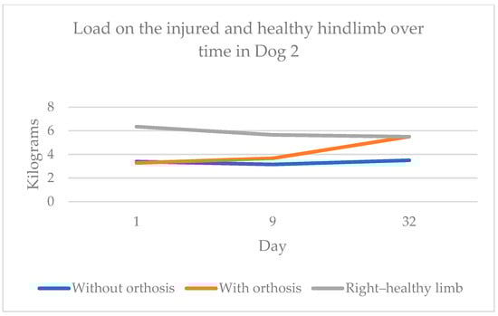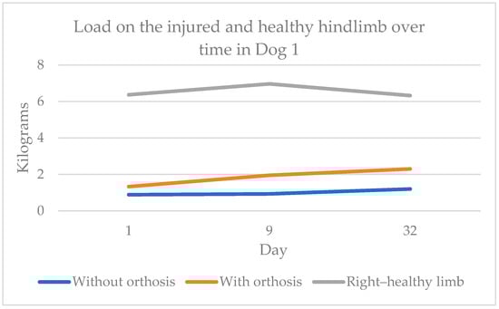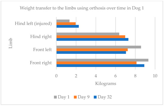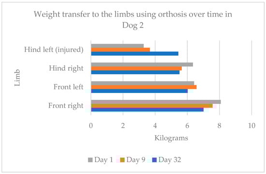 The difference amounted to 0.04 kg. For Dog 1 (Figure 6), on day 1 of orthosis use, 70% of the body weight was transferred to the forelimbs and 30% to the hindlimbs. By day 32, this shifted to 62% on the forelimbs and 38% on the hindlimbs. The data also show that, on average, 62% of the dog’s body weight was borne on the uninjured side (right forelimb and hindlimb) and 38% on the injured side (left forelimb and hindlimb).