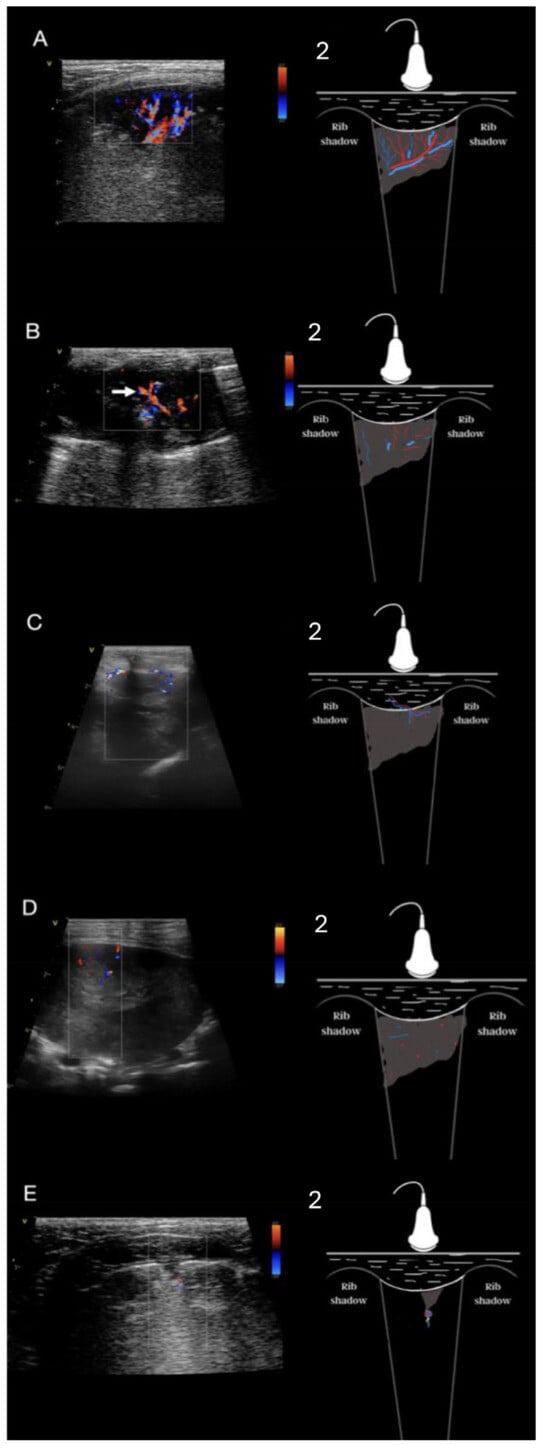 Regions of ASLT were also classified according to the vascular criteria using the CD/PD mode. The presence or absence of blood flow in the non-aerated lung tissue and the spatial structure of the vascularization were assessed [25,26]. Five distinct vascular patterns were described within the ASLT: anatomical tree-like vascularization, residual vascularization, chaotic vascularization, vascularization penetrating from the chest wall into the consolidation, and blood flow amputation, referred to as the “vascular sign”. Tree-like vascularization is characterized by prominent, dilated blood vessels branching toward the lung’s periphery, creating images that resemble a tree (Figure 2A, Video S1). Residual vascularization is described as the presence of tree-like vessels but significantly less prominent and present only in some portions of the airless lung tissue (Figure 2B, Video S2). Chaotic vascularization is created by tiny blood vessels coursing through the consolidation in various directions without any resemblance to the normal anatomy of the lung (Figure 2D). Penetrating vascularization is characterized by one or more vessels connecting the intercostal arteries with the consolidation (Figure 2C, Video S3). The “vascular sign” (Figure 2E, Video S4) is believed to result from vessel occlusion by embolic material [3,26,27]. Abrupt cessation of blood flow at the “tip (i.e., the narrow, centrally located end) of the consolidation can be seen in CD/PD. In some cases, the blood flow profile was assessed using pulsed wave Doppler mode [28] to differentiate residual and chaotic vascularization [29]. Chaotic vascularization is characterized in human medicine as having a low velocity and low resistance flow profile in pulsed wave Doppler analysis [17,25,29,30].