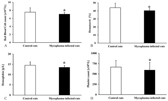 Red blood cell count (A), hematocrit (B), hemoglobin (C), and platelet count (D) values for all animals compared to the control group; Mean ± SD * p < 0.05 vs. Control (n = 22) (Mycoplasma infected n = 25).