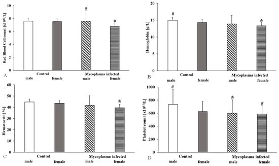 Red blood cell count (A), hemoglobin (B), hematocrit (C), and platelet count (D) values in a sex comparison, Mean ± SD * vs. Control male (n = 8); # vs. Control female (n = 14); Mycoplasma infected female (n = 17), (Mycoplasma infected male n = 8).