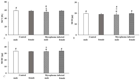Mean cell volume (MCV) (A), Mean cell hemoglobin (MCH) (B), and Mean cell hemoglobin concentration (MCHC) (C) values in a sex comparison; Mean ± SD * vs. Control male (n = 8); # vs. Control female (n = 14); + vs. Mycoplasma infected female (n = 17), (Mycoplasma infected male n = 8).