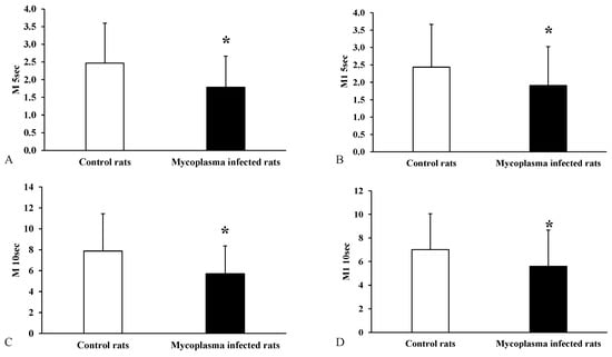 Aggregation index values for all animals compared to the control group, (A): M5 s; (B): M1 5 s; (C): M10 s; (D): M1 10 s; Mean ± SD * p < 0.05 vs. Control (n = 22) (Mycoplasma infected n = 25).