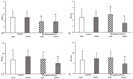Aggregation index values in the sex comparison, (A): M5 s; (B): M1 5 s; (C): M10 s; (D): M1 10 s; Mean ± SD * vs. Control male (n = 8); # vs. Control female (n = 14); Mycoplasma infected female (n = 17), (Mycoplasma infected male n = 8).