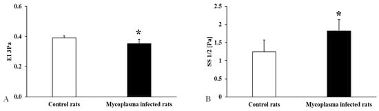 Deformability measurement data for all animals compared to the control group, (A): EI 3 Pa; (B): SS1/2; Mean ± SD * p < 0.05 vs. Control (n = 22) (Mycoplasma infected n = 25).