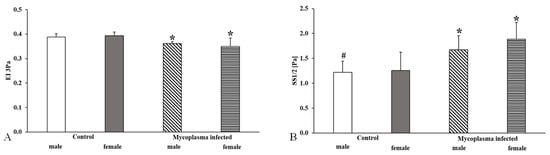 We observed the same in the studies between the sexes (EI 3Pa: male vs. control male p < 0.001; female vs. control female p < 0.001; SS1/2: male vs. control male p < 0.001, vs. Mycoplasma infected female p = 0.033; female vs. control female p < 0.001) (Figure 7).