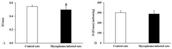 Osmotic gradient deformability measurement data for all animals compared to the control group, (A): EImax; (B): O(EImax); Mean ± SD * p < 0.05 vs. Control (n = 22) (Mycoplasma infected n = 25).