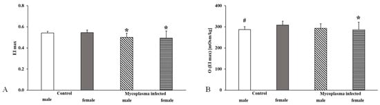 Examining these parameters between the sexes, we saw that in the case of females, there was also a significant change in the osmolality values associated with the maximum elongation index (EImax: Mycoplasma male vs. control male p = 0.021; Mycoplasma female vs. control female p < 0.001; O(EImax): Mycoplasma female vs. control female p = 0.04), while we did not see a significant difference in males (Figure 9).