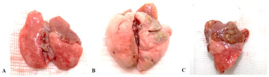 The infection primarily affects the respiratory system, initially without symptoms, but, with advancing age, difficulty breathing, sneezing, and runny nose can appear [2,3,4,8]. Macroscopically visible lesions appear in the lungs, and multiple fused abscesses often develop, with tan-white discharge. The lungs are watery and swollen, and pulmonary congestion and purulent or necrotic pneumonia are common [1,2,8,34]. In the majority of examined animals, we have seen necrotic lesions and abscesses in the lungs. In addition, lung hyperplasia was observed in several animals. In histological examination, lymphocytes, neutrophils, macrophages, and fibrin were described in pulmonary tissue. Degenerated and viable neutrophils, necrotic cell debris, and fibrin accumulate in the trachea. Neurogenic inflammation in the mucosa of the respiratory tract was also described [1,4,9,34,35].