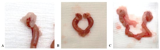Macroscopic pictures of female rat reproductive tract. (A): Perioophoritis, salpingitis; (B): Suppurative endometritis; (C): Pyometra.