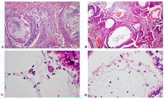 Microscopic pictures of the lung tissue (A,B): Lung tissue with abscesses, infiltration of inflammatory cells: lymphocytes and neutrophil cells (4×) scale bar = 200 µm; (C,D): Tissue disintegration in rat lungs, infiltrated with: lymphocytes, neutrophils and macrophages (40×) scale bar = 50 µm. Hematoxylin-eosin stain.