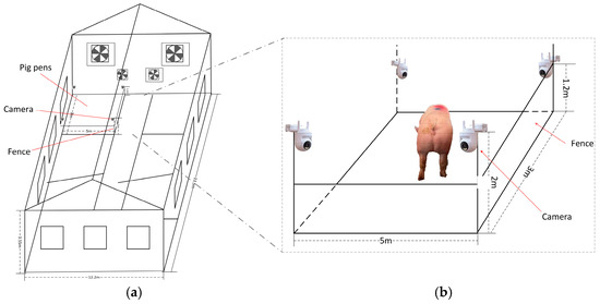 Data acquisition process. (a) Structure of the pig farm; (b) data collection process.