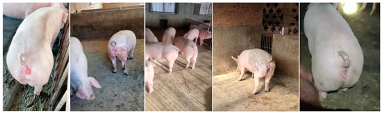 Following augmentation, a sow estrus dataset comprising 6402 images was obtained. This dataset includes vulvar images corresponding to the five estrous stages: false estrus, anestrus, pro-estrus, estrus, and post-estrus. The dataset was partitioned using random sampling, with a training-to-testing-to-validation ratio of 7:1:2. Specifically, 4481 images were allocated to the training set, 640 to the testing set, and 1281 to the validation set. The distribution of the sow estrus dataset is presented in Table 1. Representative vulvar images of the sows in natural pro-estrus and false estrus induced by zearalenone poisoning are shown in Figure 3, while sample images from the dataset are displayed in Figure 4.
