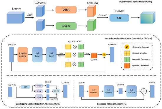 The recent studies have demonstrated that integrating global contextual information with local details significantly enhances model robustness and performance in complex object detection tasks. For instance, the Vision Transformer (ViT) has achieved remarkable results using a self-attention mechanism; however, it lacks effectiveness in local feature extraction. To address this limitation and better capture both global and local features, we introduce a lightweight dual dynamic token mixing network module, termed the Dual Dynamic Token Mixer (DDTM) [36]. The DDTM processes input features through two parallel streams, one employing a global self-attention module, and the other utilizing an input-dependent depthwise convolution module. The outputs are then fused to enhance contextual understanding and local feature extraction. In this study, we integrate the DDTM into two C2f modules within the YOLOv8 backbone, forming the C2fDDTMAttention module, which strengthens feature extraction and improves detection performance. The network structure of the DDTM is illustrated in Figure 6.