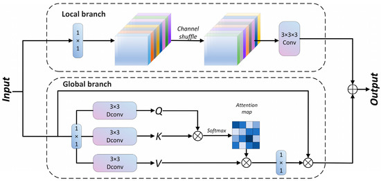 In object detection, the fusion of global contextual information with local features is crucial for enhancing the small-object detection performance. To further improve the modeling of global and local features, we introduce a Convolution and Attention Fusion Module (CAFM) [37], which combines convolution for local feature extraction with self-attention for global information modeling. The CAFM consists of separate branches for global and local feature processing; the convolutional branch focuses on detailed local feature representation, while the attention mechanism captures long-range dependencies. By embedding the CAFM into the YOLOv8 backbone, we enhance the network’s ability to model complex spatial relationships, thereby improving detection accuracy. The structure of the CAFM module is shown in Figure 7.
