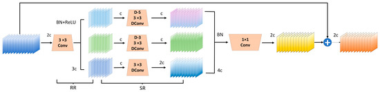 Dilated convolution, a technique for expanding the receptive field, has been widely applied in object detection. Given the challenge of detecting small vulvar regions in sow estrus images, we introduce a feature extraction module based on dilation-wise residual learning (Dilation-wise Residual, DWR) [38] to capture multi-scale contextual information from a single input feature map, while reducing feature extraction complexity. DWR leverages dilated convolutions to expand the receptive field, while maintaining computational efficiency. The module decomposes feature learning into regional residualization and semantic residualization; the regional residualization phase applies grouped depthwise separable dilated convolutions with varying dilation rates to improve learning flexibility, whereas the semantic residualization phase employs morphology-based filtering to extract the key semantic structures, ensuring more effective small-object detection. By integrating DWR into the YOLOv8 neck, we achieve efficient multi-scale feature fusion and enhance the model’s ability to focus on small vulvar regions during estrus detection. The DWR module structure is illustrated in Figure 8.
