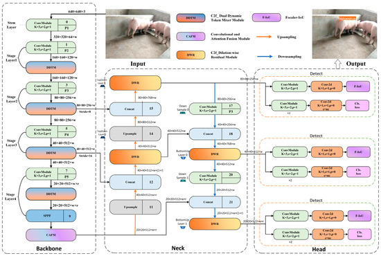 II. To address the small-target detection challenge of sow vulva images, three attention enhancement mechanisms (CAFM, DDTM, and DWR) and a bounding box regression loss function (Focaler-IoU) are incorporated into YOLOv8. The effectiveness of these methods in improving the model’s performance is also explored.