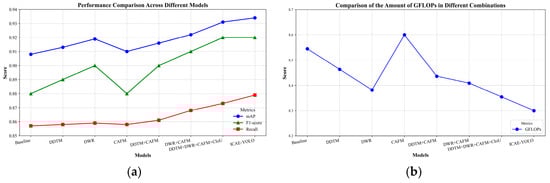 Performance improvement effect of each module combination on the algorithm. (a) Comparison of recognition performances; (b) comparison of GFLOPs.
