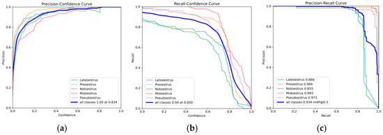 The experimental results presented in Table 4 validate the effectiveness of ICAE-YOLO in accurately identifying the pseudo-estrus and various estrus phases in sows. Figure 11 illustrates the precision–confidence, Recall–confidence, and P-R curves of ICAE-YOLO, while Figure 12 provides additional detailed results. Furthermore, Figure 13 offers a focused visualization of ICAE-YOLO’s performance in recognizing the different pseudo-estrus, non-estrus, and estrus phases. As shown in Figure 12, the train/box_loss metric exhibits a rapid decline from approximately 2.5 to 1.5 within the first 100 epochs, indicating the model’s quick adaptation in accurately localizing the target bounding boxes. As training progresses, train/box_loss continues to decrease, approaching zero, which signifies the model’s high precision in predicting the sow’s vulva position within the training images. Train/cls_loss starts at around 6.9 and drops sharply to approximately 1.0 within the first 100 epochs, demonstrating the model’s rapid improvement in correctly classifying the targets within the bounding boxes. It continues to decline, converging around 210 epochs, reflecting a consistent enhancement in classification accuracy on the training set. Similarly, train/dfl_loss, initially occurring at about 2.25, decreases to approximately 1.1 within the first 100 epochs, contributing to the model’s improved confidence in bounding box coordinate predictions. It further falls below one after 240 epochs, indicating increased precision in bounding box localization on the training set.