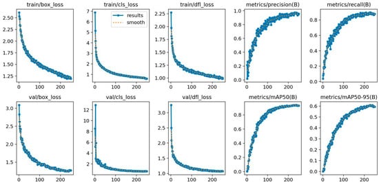 In this study, the input image size was standardized to 640 × 640 pixels. To accelerate convergence, the initial learning rate was set to 0.01, with a weight decay coefficient of 0.0005 and a momentum factor of 0.937. The model was trained for 250 epochs with a batch size of one.