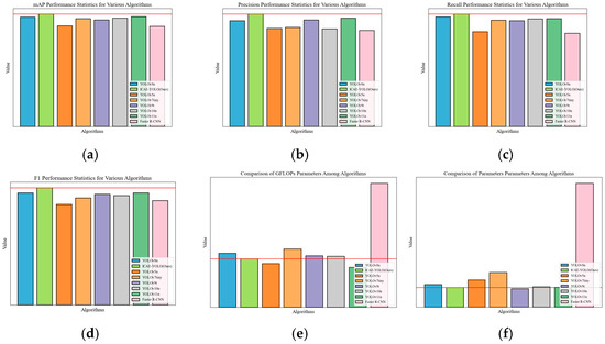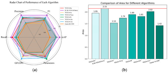 To provide a comprehensive performance comparison, a radar chart (Figure 18) was plotted. For consistency, the GFLOPs and the parameter counts were normalized inversely, meaning that lower values indicate a higher computational load and larger parameter counts, while values closer to one represent lower computational demands and greater efficiency. The radar chart reveals that although ICAE-YOLO slightly lags behind YOLOv9t and YOLOv11n in computational efficiency, it covers a larger overall area with a well-balanced distribution across the various performance metrics, demonstrating superior overall effectiveness.