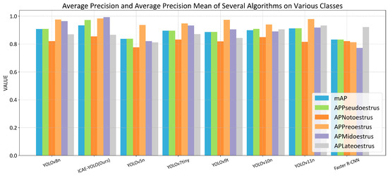 The Confusion Matrix [40] is a table used in machine learning and deep learning to evaluate the performance of classification algorithms, typically by visualizing and analyzing the results of classification models. Average Precision (AP) is a metric used to measure the performance of tasks such as object detection and image classification. In object detection, AP assesses the degree of overlap between predicted and ground truth bounding boxes, with a range from 0 to 1. A value of 1 indicates a perfect performance, while 0 indicates a poor performance. A higher AP value reflects better accuracy and Recall for the detection algorithm in the corresponding class. The evaluation metrics used in this study include APPseudoestrus, APNotoestrus, APPreoestrus, APMidoestrus, APLateoestrus, and APAllclass, which represent the average precision for the pseudo-estrus, non-estrus, pre-estrus, mid-estrus, and late-estrus phases, as well as the mean average precision (mAP) across all the five classes. Additionally, other important evaluation metrics are also discussed below.