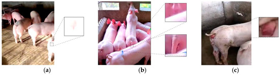 To capture the vulva of the sows from different angles and postures, while ensuring image clarity, four cameras were positioned at the corners of the pig pen, approximately 80 cm above the fence height. The camera placement is shown in Figure 1b, with Xiaomi CW500 cameras (model MJSXJ07HL, Xiaomi Corporation, Beijing, China) used for the task. To increase the dataset’s diversity, some images were also captured using handheld devices from multiple angles. A total of 219 video clips from 26 pigs were collected during the data collection phase, each ranging from 5 to 60 s in length, with a frame rate of 30 fps. These videos covered all the five stages of sow estrus: false estrus, non-estrus, pro-estrus, estrus, and post-estrus. Frame extraction technology was used to sample one frame every 15 frames, resulting in a total of 3172 images.