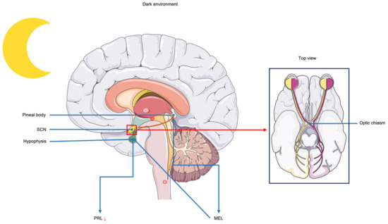 Inhibitory effect of melatonin on prolactin. When the environment is dark, nerve impulses generated in the suprachiasmatic nucleus (SCN) act on the pineal gland to promote its secretion of melatonin (MEL). MEL has an inhibitory effect on the pituitary gland and reduces prolactin (PRL) secretion. When the environment is bright, MEL secretion decreases, the inhibitory effect on the pituitary gland decreases, and PRL secretion increases. The arrows in the figure indicate a reduction in PRL secretion, with “⊖” representing inhibition of the process and “⊕” representing promotion of the process.