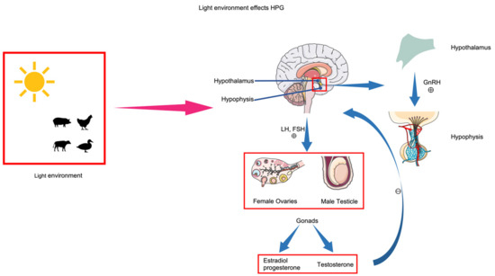 Lighting affects the hypothalamic–pituitary–gonadal (HPG) axis. The conversion of light signals into biological signals stimulates the hypothalamus to secrete gonadotropin-releasing hormone (GnRH). GnRH stimulates the pituitary gland to secrete gonadotropins (Gn). Gn acts on the gonads (testes in males, ovaries in females), which secrete sex hormones. Sex hormones, in turn, inhibit the activity of the hypothalamus and hypophysis.