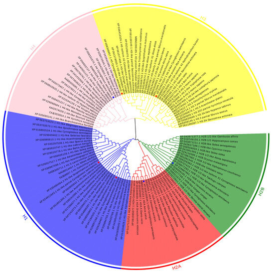RNA was extracted from different tissues by the RNA extraction kit (TianGen Biotech, Beijing, China). cDNA was synthesized by the PrimeScriptTM RT Kit (TaKaRa, Kyoto, Japan), and the final sample was stored at −20 °C. The primers h1.1-like-qF/R, h1.2-like-qF/R, h3-qF/R, and h3.3-like-qF/R (Table S1) were designed to analyze the expression patterns of the genes in different tissues and developmental stages. THUNDERBIRDTMNext SYBR®qPCR Mix (TOYOBO, Osaka, Japan) and the real-time fluorescent quantitative PCR system (Applied Biosystems, Waltham, MA, USA) were used for qPCR. The following protocol was set for qPCR: 95 °C for 30 s, 95 °C for 5 s, 60 °C for 30 s. Then, 40 cycles were performed. β-actin was used as the internal reference gene, and each group was repeated 3 times. The experimental data were calculated by the 2−∆∆ct method [20]. SPSS 26.0 was used for multiple comparative analyses of the data by One-way ANOVA, and a p-value less than 0.05 was considered to indicate a significant difference between the two groups. In multiple comparisons, a and b are groups with different degrees of differential expression.