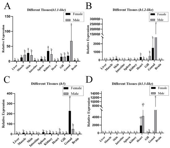 (A) Expression patterns of h1.1-like in different tissues. (B) The expression pattern of h1.2-like in different tissues. (C) Expression patterns of h3 in different tissues. (D) Expression pattern of h3.3-like in different tissues. A p-value less than 0.05 was considered to indicate a significant difference between the two groups. In multiple comparisons, different alphabets indicated significant difference.
