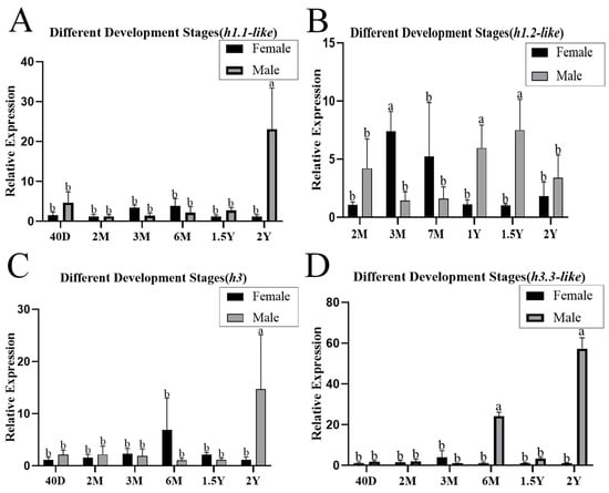 (A) Expression pattern of h1.1-like in different periods of gonadal development. (B) Expression pattern of h1.2-like in different periods of gonadal development. (C) Expression pattern of h3 in different periods of gonadal development. (D) Expression pattern of h3.3-like in different periods of gonadal development. A p-value less than 0.05 was considered to indicate a significant difference between the two groups. In multiple comparisons, different alphabets indicated significant difference.